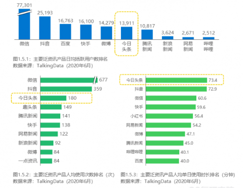 事实上,在头部泛资讯产物N足鼎峙确当下,行业已经正式进进用户的存量市场,时长的增量市场。本日头条经由过程捉住用户的需求痛点,以智能推举晋升内容分发的正确度、用户范围与用户粘性。依据相干调研数据,在以日均活泼用户数DAU、人均应用次数、人均单日应用时长作为评判尺度时,微信、抖音、本日头条等泛资讯App的用户应用数据位居行业前列。此中,本日头条的人均单日应用时长居于行业首位。